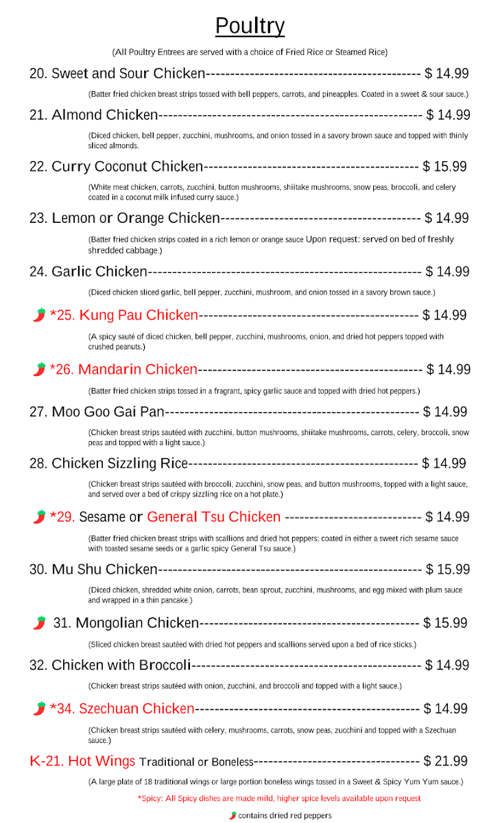 (Batter fried chicken breast strips with scallions and dried hot peppers; coated in either a sweet rich sesame sauce with toasted sesame seeds or a garlic spicy General Tsu sauce.)