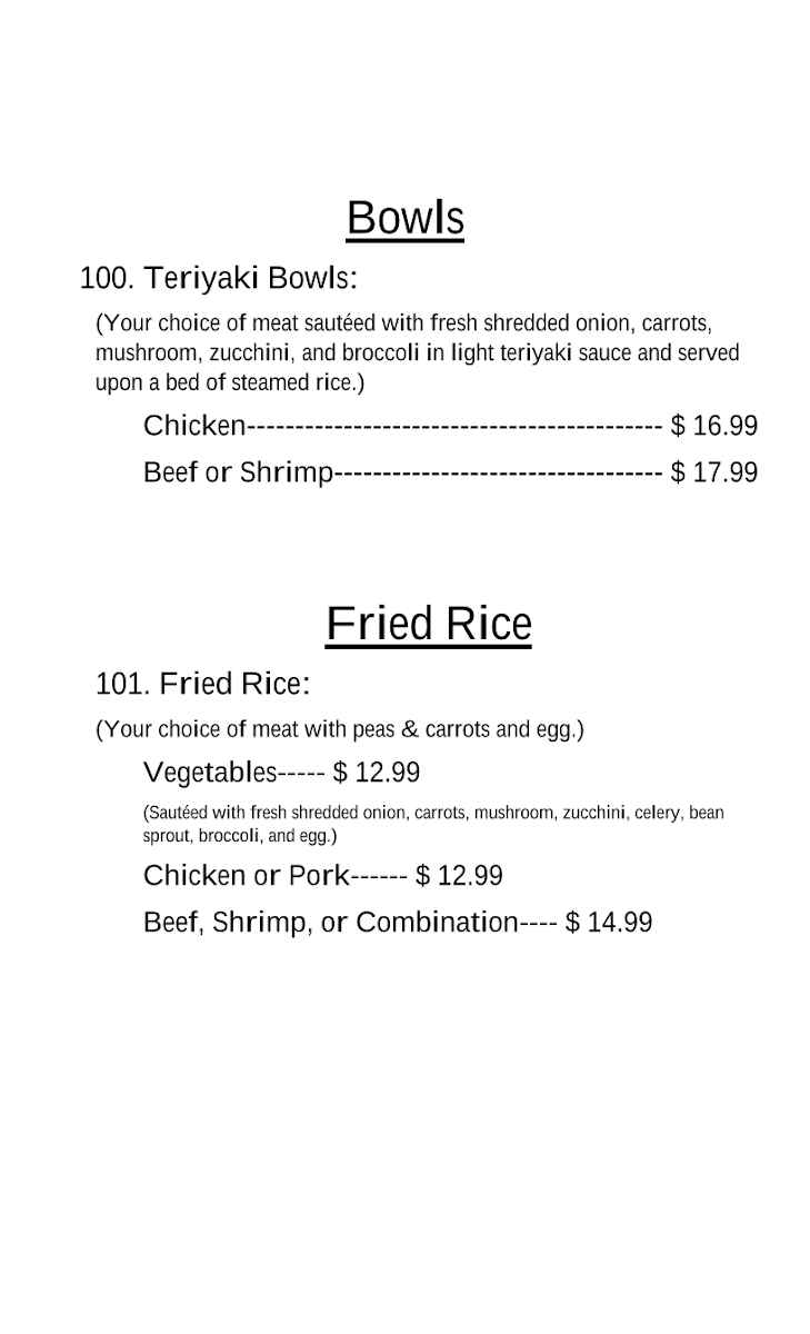 (Your choice of meat sautéed with fresh shredded onion, carrots, mushroom, zucchini, and broccoli in light teriyaki sauce and served upon a bed of steamed rice.)