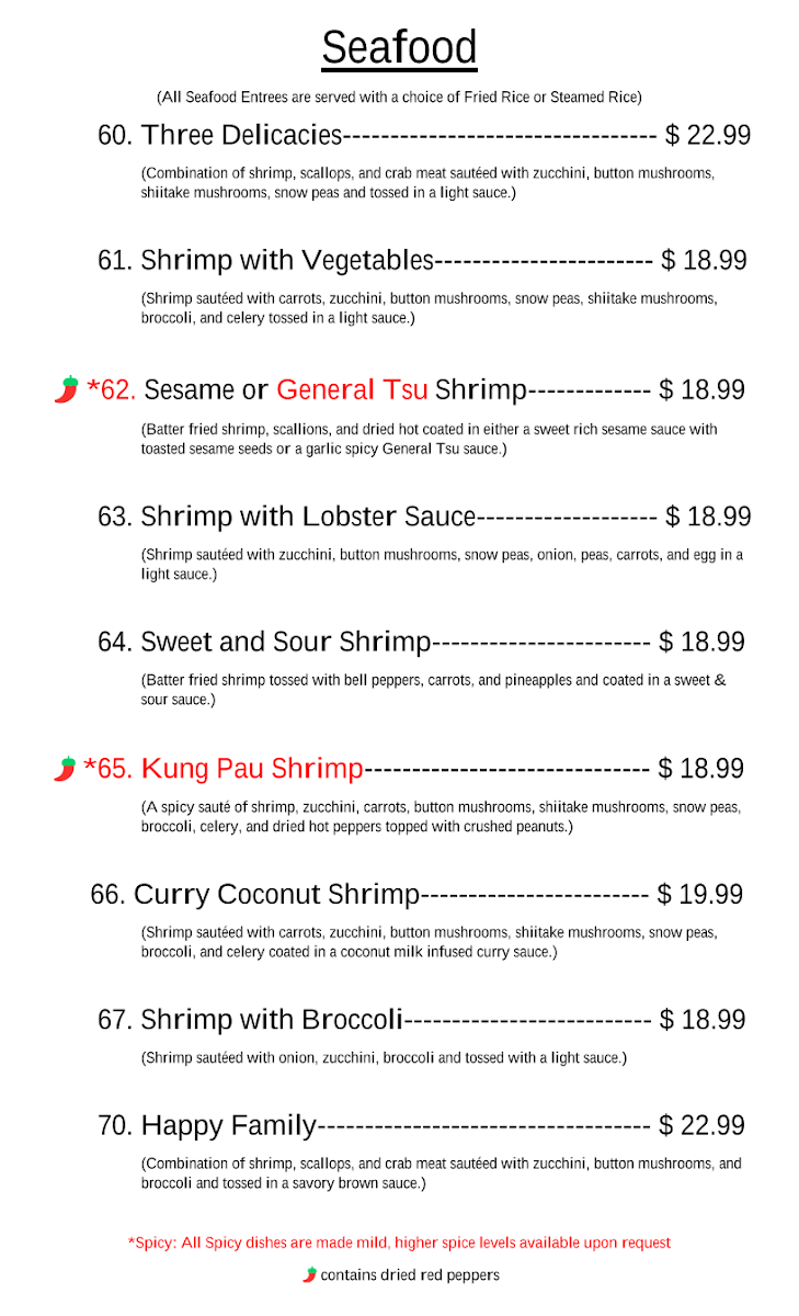 (Batter fried shrimp, scallions, and dried hot coated in either a sweet rich sesame sauce with toasted sesame seeds or a garlic spicy General Tsu sauce.)