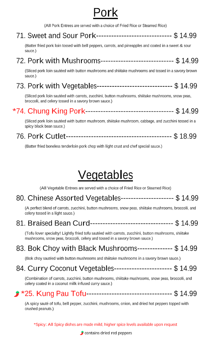 (Fried pork sauteed with broccoli, celery, zucchini, mushrooms, and carrots in a spicy Szechuan sauce)