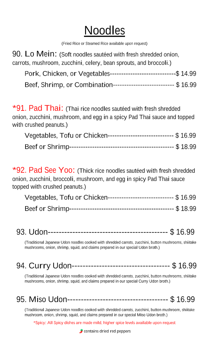 (Soft noodles sautéed fresh shredded onion, carrots, mushroom, zucchini, celery, bean sprouts, and broccoli.)