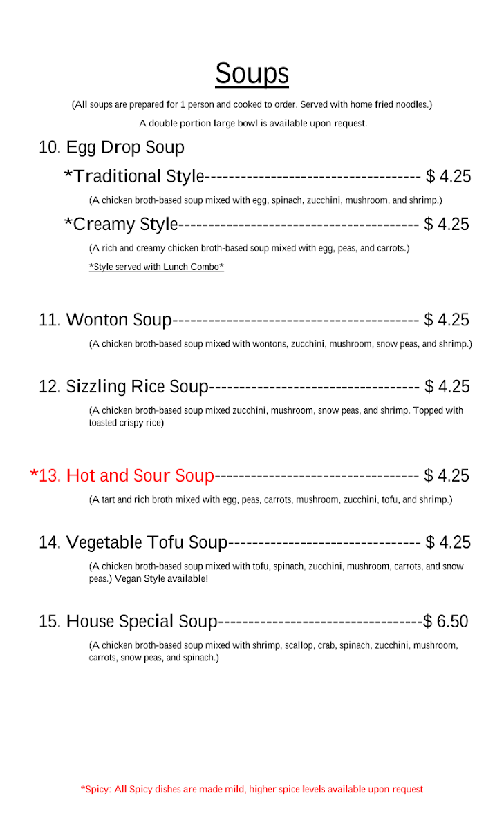 (A chicken broth-based soup mixed with tofu, spinach, zucchini, mushroom, carrots, and snow peas.) Vegan Style available!
